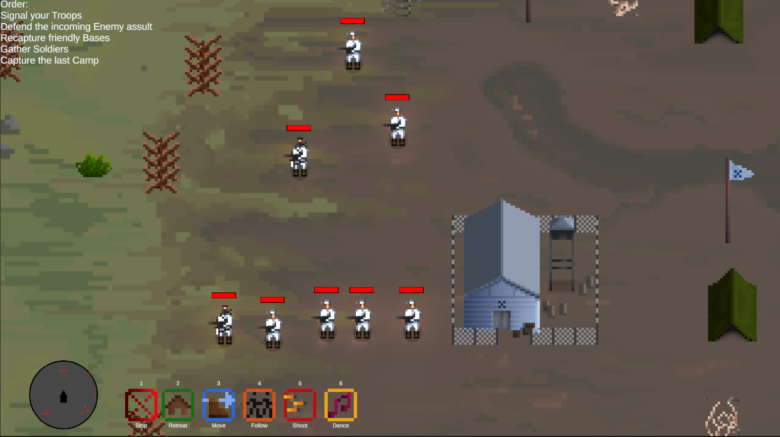 Objective You are the commander of a platoon that has been pushed back to its final camp. After eliminating the enemy commander, their forces have fallen into disarray. Use the signals you and your soldiers have trained for to coordinate effectively and eliminate the remaining enemy units.